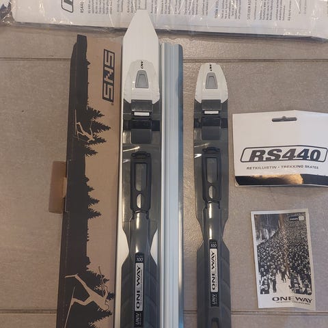 Setti on hyvässä kunnossa ja täysin käyttövalmis. Monot ja siteet ovat valmiiksi kiinni terissä, joten pääset suoraan jäälle.
