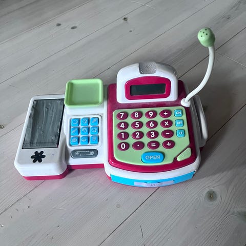 Leikkiruokia, astioita ja kassakone. Nouto tykki/kiviharju.
