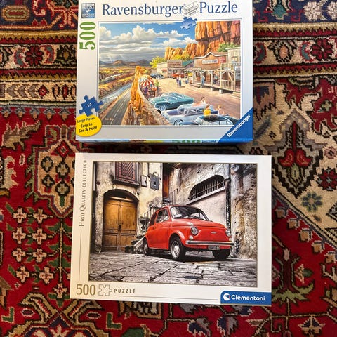 Ravensburger palapelit, joissa kummassakin 500 palaa. Palapelien kuvat esittävät erilaisia aiheita. Sopii aikuisten ja lasten käyttöön.