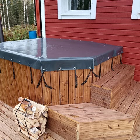 Tehdäänkö tästä sinulle edullisesti muotoon (pyöreä, nelis, kuusi tai kahdeksan kulmainen) vahva kotimainen kylpytynnyrin Suojapressukansi, kunnon vahvoilla teollisuus kiinnitysrenkailla. Kiinnitysrenkaat laitetaan haluamallasi jaolla tai esim 30-35cm ympäri pressun. Pvc-Kangas jota käytämme on 700-900g neliöpainoltaan olevaa suomalaista vahvaa Pvc-pressua. Pvc-kangas on UV-ja homesuojattu näin auringonvalo ei sitä haprastuta Kuten halvoissa pressuissa hyvin usein tuuppaa käymään. Kylpytynnyrin kannet tehdään yleensä 10-15cm ylityksillä perpuoli. Kannen kiinnitys onnistuu helposti kumiköydellä tai kumijousteilla ja kiinnitysnapeilla.