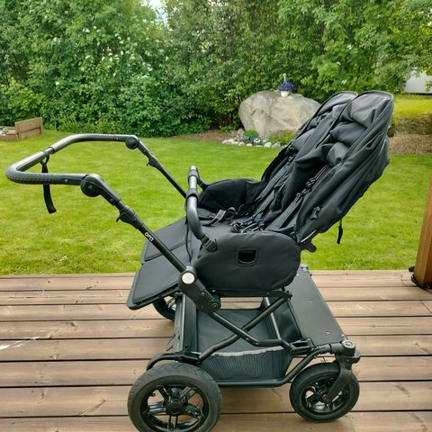 Mustat Oran rattaat/vaunut kaksosille tai sisaruksille. Mukaan kaksi kantokoppaa, patja ja reunus, sadesuoja, renkaiden suojia, lämpöpeitettä, integroitu hyttysverkko. Ostettu kuusi vuotta sitten uutena ja käytetty ensimmäiset kolme vuotta.