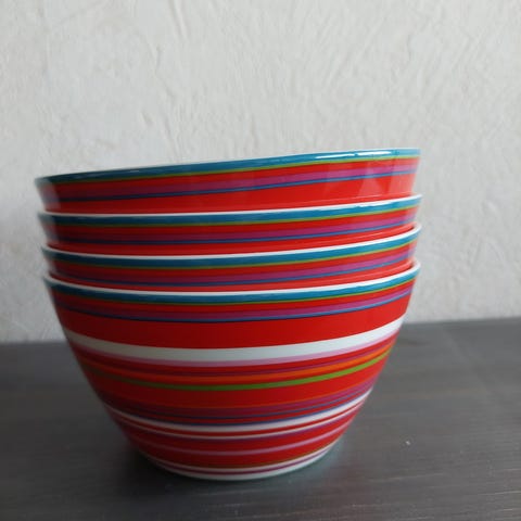 Iittala Origo-kulhot, joissa on värilliset raidat.