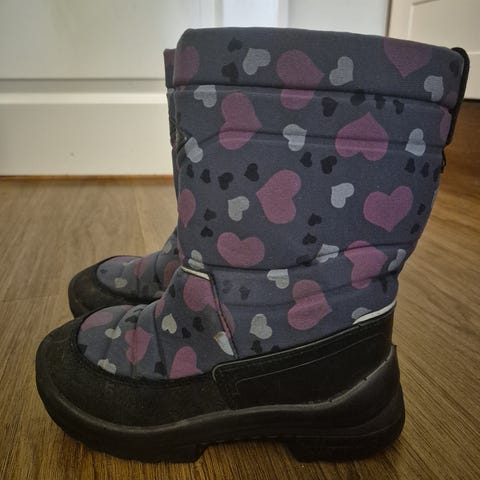Yhden lapsen ahkerassa käytössä olleet Kuomat , kantapään kohdalla sisäpuolella kulumaa, ja toisen kengän kuvio haalistunut yhdestä kohdasta housunlahkeen hangatessa.