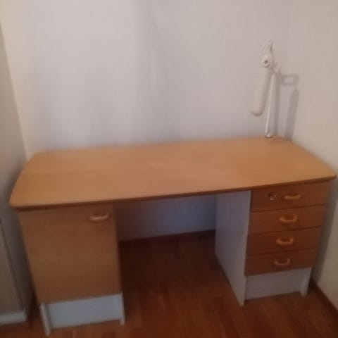Noin 20 vuotta sitten uutena hankittu kirjoituspöytä, jossa vasemmalla puolella kaappi ja oikealla puolella neljä isohkoa laatikkoa. Käsittääkseni Suomessa tehty ja umpimäntyä. Käyttövuosilta hieman kulumajälkiä ja pienellä fiksauksella kuin uusi. Noudettavissa.