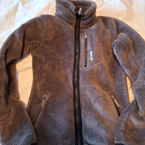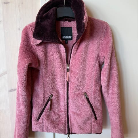 Punainen hyväkuntoinen fleecetakki, edessä Lena Furbergin piirtämä ponin pää kirjailtuna.