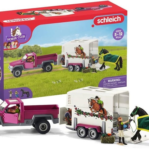 Schleich punainen maastoauto, vihreä hevosenkuljetusvaunu ja kuvan hevonen. Autossa kaksi istuinta ja ovet aukeavat. Kuljetusvaunussa on takaluukku, joka avautuu hevosen lastaamista varten. Autosta ratti kadonnut. Nouto Viertola.