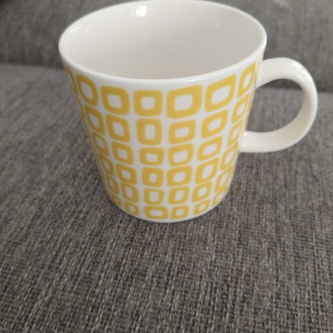Arabia muki, jossa on musta- ja valkoinen ruutukuvio. Ehjä ja erittäin siisti kuntoinen. Valmistusvuosi: 1990-2000-luku. Materiaali keramiikka. Käytettävissä juomien nauttimiseen.