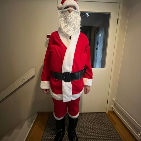 Joulupukin asu, joka sisältää takin, housut, vyön, hatun ja parran.