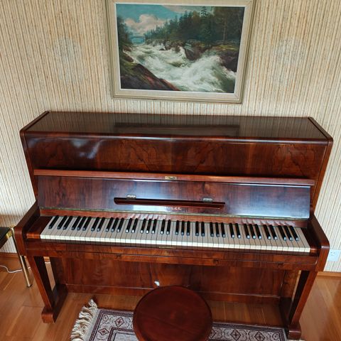 Vaalea pystypiano, jossa valkoinen pinta. Sisältää pianotuolin, jossa on ruskea verhoilu ja säädettävä korkeus. Vaatii virityksen.