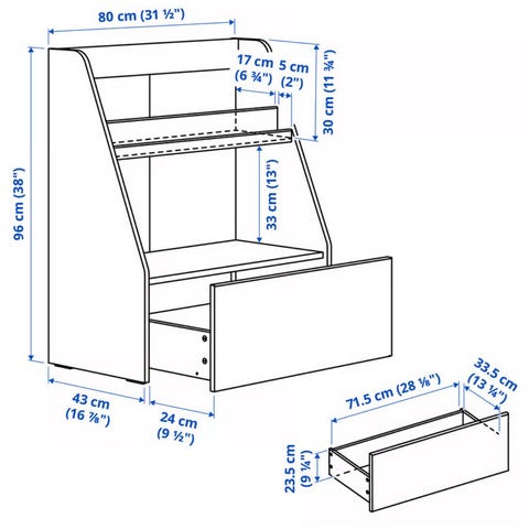 Oikein hyväkuntoinen IKEA Kallax-senkki, jossa on kuusi vetolaatikkoa vaaleanvihreillä etupaneeleilla sekä kaappi turkoosinsinisellä ovella, jossa on kellotaulu. Viisarit ovat liikuteltavat.