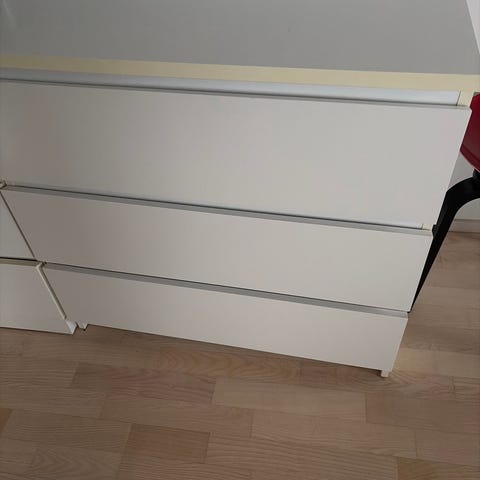 Ikean Malm lipasto kolmella laatikolla ja lasikannella.