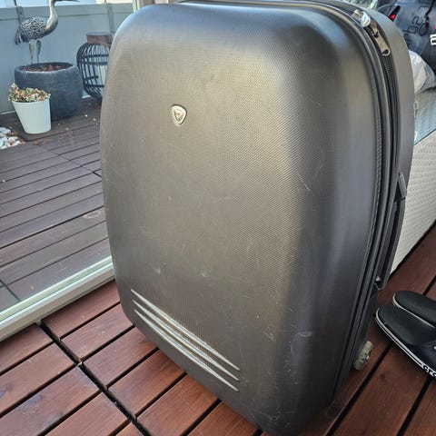 Iso musta matkalaukku. Ehjä ja siisti. Pyörät kulkevat vain yhteen suuntaan, eli matkalaukkua ei voi työntää sivusuunnassa. Korkeus 78 cm, leveys 58 cm ja syvyys 34 cm.