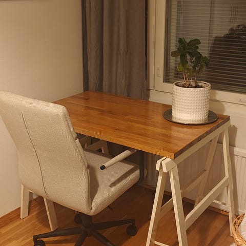 Ikea järeä pöytälevy joka on ilmeisesti tarkoitettu alunperin keittiön työtasoksi. On toiminut työpöydän pöytälevynä.