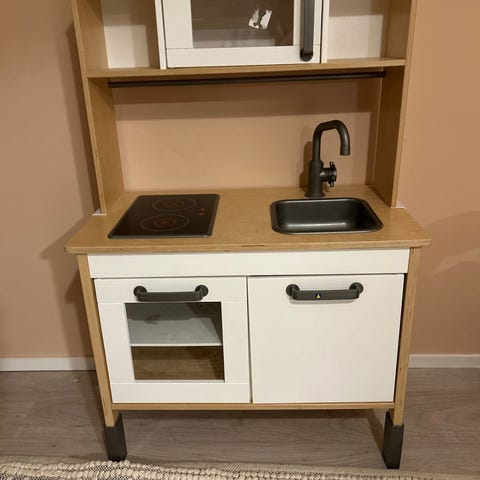 IKEA lasten leikkikeittiö, valmistettu puusta. Keittiössä on keittolevyt, allas ja säilytystilaa ovi- ja hyllyratkaisuilla. Sopii lasten leikkeihin ja leikkihuoneisiin.