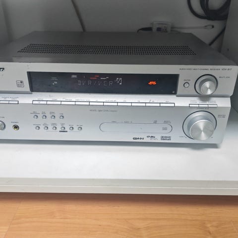 Pioneer vahvistin, jossa useita liitäntöjä kaiuttimille ja muille äänilähteille. Laite on hopeanvärinen ja soveltuu kotikäyttöön äänentoiston vahvistamiseen.