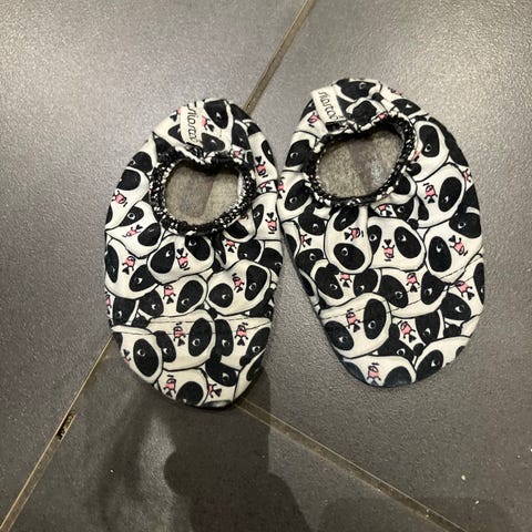 Hyväkuntoiset, kettukuvioiset slipstop-tossut. Pohjallisen mitta n. 15,5 olisiko siis n. kokoa 24-26.