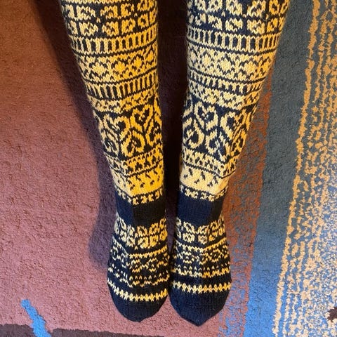 Jouluiset käsintehdyt pitkät villasukat 7-veljestä langasta. Koko noin 39.
