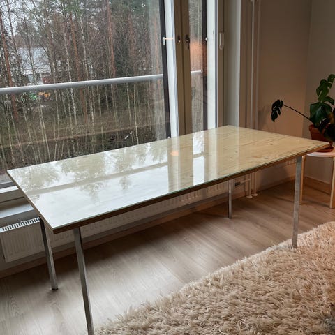 Myydään hyväkuntoinen lasipintainen Ikeata ostettu ruokapöytä. Tuolit eivät kuulu kauppaan. Nouto Vuores/Tampere.