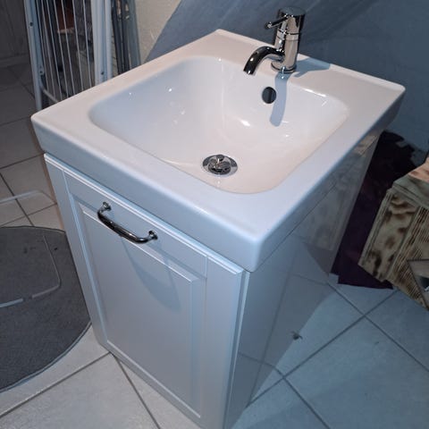 Kuvan mukainen käytetty pesuallas ja kaappi. Otettu ehjänä pois käytöstä, mutta säilytetty kylmässä, joten hanan kunnosta ei varmuutta. Altaassa näkyy kuvan mukainen pieni pore joka tunnettavissa juuri ja juuri kynnellä.