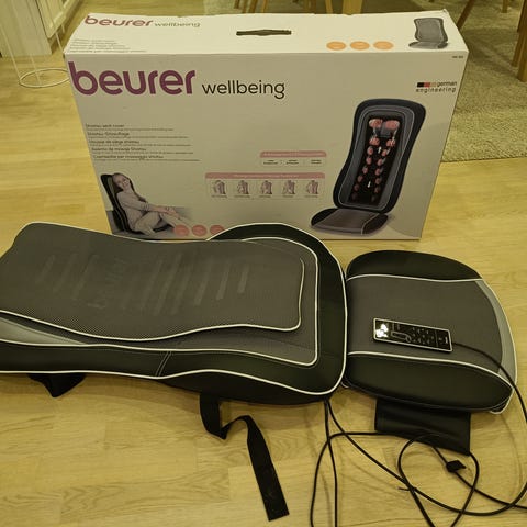 Toimiva ja ehjä laite hierontaan ja shiatsukäsittelyyn. Niskalle oma hieronta, jonka saa halutessaan pois päältä. Istuin kiinnitetään tuolin selkänojaan. Kiinnitysnauhat eivät jousta enää, mutta on sidottavissa solmuilla kiinni.