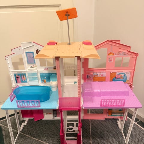 Barbie nukketalo, muovinen lasten lelu, useita kerroksia ja huoneita, vaaleanpunainen ja punainen väri. Elämää jo nähnyt Varbie Malibu-talo. Seuraavalle leikkijälle.