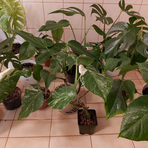 Värivirheellinen peikonlehti monstera variegata. Tekee jatkuvasti uusia lehtiä, koko nyt juuresta mitattuna reilu 80cm.