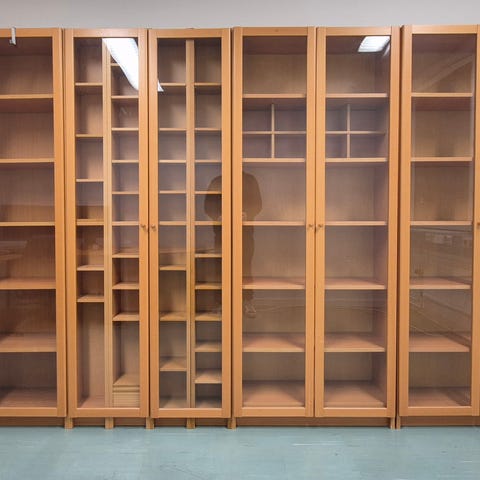 Ruskea kirjahylly lasiovilla ja neljällä lasihyllyillä.