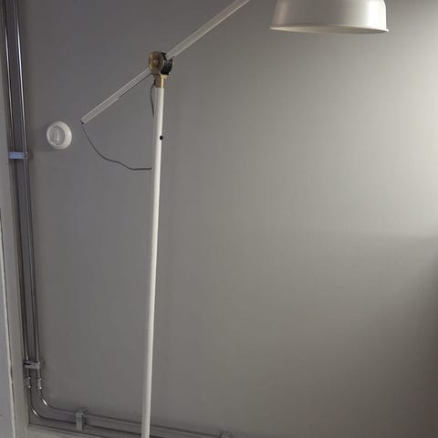 Musta lattiavalaisimen runko sekä Ikean lampunvarjostin. Kunnossa ei moitteita.