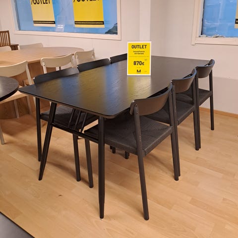 Saarnin värinen ruokapöytä ja greigat tuolit.