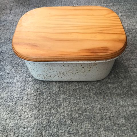 Pentikin luonnonvalkoinen keraaminen voirasia, johon mahtuu normaalikokoinen voi- tai margariinipaketti. Sivussa maalattu kuva. Puinen irtokansi.