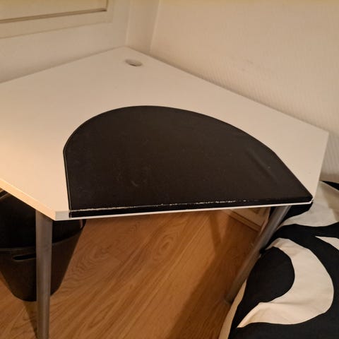 Ikea kulmapöytä musta, jossa on L-mallinen muotoilu. Pöytälevy on musta ja jalat ovat metallia. Pöytä sopii toimistokäyttöön tai kotitoimistoon.