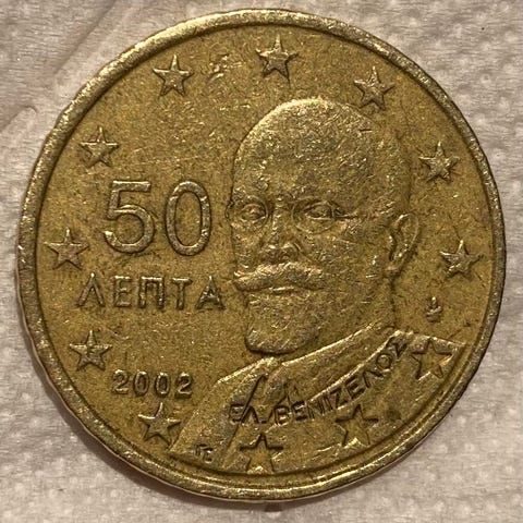 Kaksi RF 50 sentin kolikkoa vuosilta 1999 ja 2001.