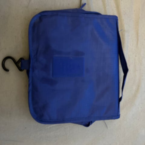 Pakkauksessaan oleva toilettilaukku. Sisältö arvatenkin sukat, unimaski ja jotain muuta. Jos jotain ’kosmetiikkaa’ ei välttämättä kuranttia (muutaman vuoden ollut kaapissa). Jää ainakin yksilöllinen toilet bag.