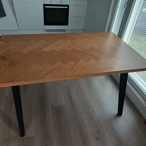 Laajennettava Askon valmistama ruokapöytä, jossa on puinen kansi ja valkoiset jalat. Pöydän keskiosa voidaan avata lisälevyn asettamiseksi +50cm, mikä tekee siitä käytännöllisen isommille seurueille. Pöydän muotoilu on yksinkertainen ja ajaton, sopien monenlaisiin sisustustyyleihin. Pöydän pinnassa on joitakin naarmuja ja kulumia, mutta yleisilme on siisti. Pöytä hieman keskeltä taipunut alas ja suoristus vaatii kiinnitysten kiristämistä. Jalat ovat tukevat, mutta niissä on pieniä maalivaurioita. Laajennusmekanismi hieman jäykkä avata.