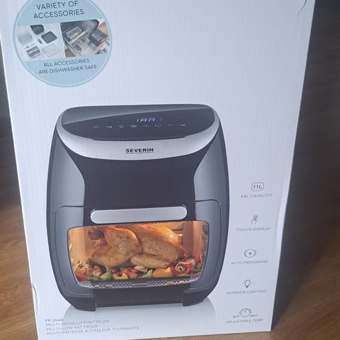 Monipuolinen Airfryer tehtaan pakkauksessa. Takuu 2 vuotta. 5,4 litran paistokori. 8 automaattiohjelmaa, digitaalinen kosketusnäyttö. Nyt halvalla !!