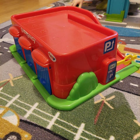 Parkkitalo, jossa useita tasoja ja punainen liukumäki. Leikkisetti on valmistettu muovista ja soveltuu lasten leikkeihin. Kahdessa kohtaa liitoksessa murtuma, teipattu (voi itse laittaa haluamallaan tavalla), ei estä käyttöä. Uusi yli 50€.