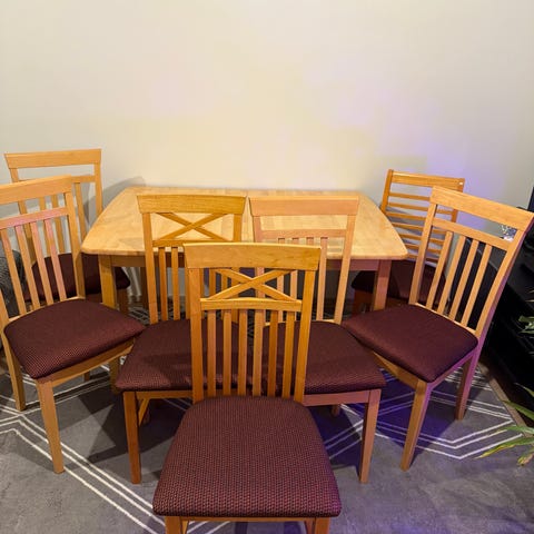 Tuoleja 6kpl ja pöytä kaikki kerralla.