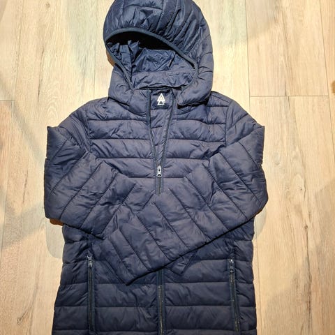 Musta kevyttoppatakki. Vetoketjut taskuissa ja hupussa.