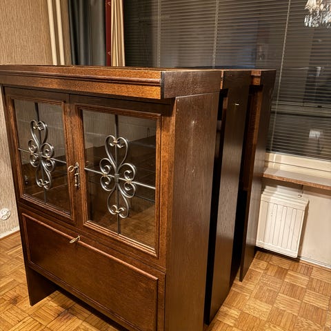 Hiomista, lakkaamista ja tekstiilien vaihtoa kaipaa. Toisessa jalassa halkeama, joka kuvassa. Kestää hyvin vielä istumista. Tammea vaikuttaa olevan.