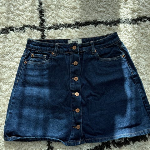 Hyväkuntoinen Love Denim farkkuhame. Kokomerkintä 10, mutta vastaa M-kokoa. Vyötärön leveys 40 cm ja pituus 55 cm.