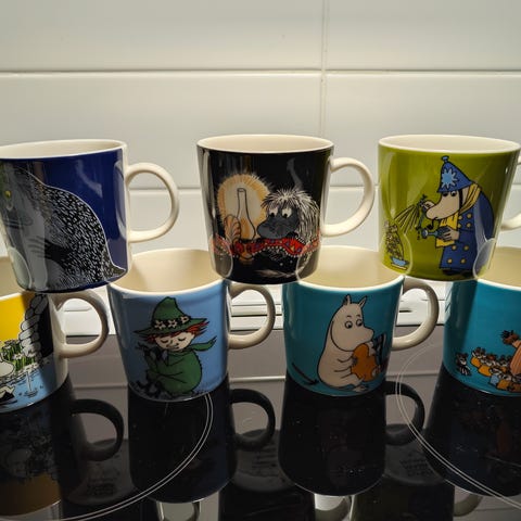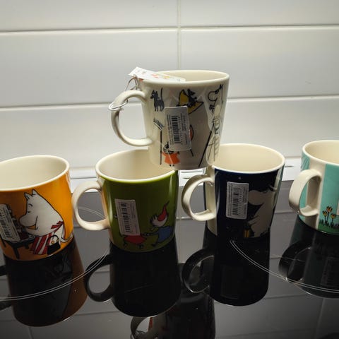 Kuvan muumimukit, tarrattomia mutta vain koristeena ollut. 10€/kpl.