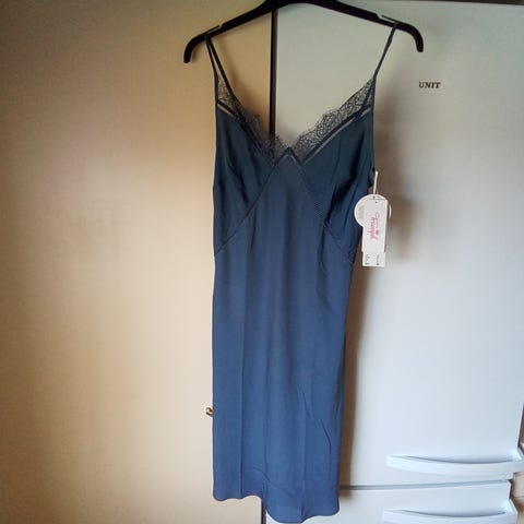 Kaunis elegantti yöpaita. Yläosa on tukevampi ja laskeutuva A- linjanen osa on kevyestä hieman läpinäkyvästä materiaalista. Säädettävät olkaimet. Pituus olkapää-helma 94cm.