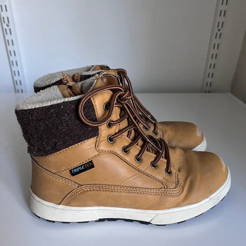 Lasten lämmin vuoriset My Wear vaalean ruskeat talvikengät, joissa nauhat ja vetoketju sisäsivulla. Käytetty vain kerran, koska ostimme väärän kokoiset. Sisämitta n. 22,5 cm.