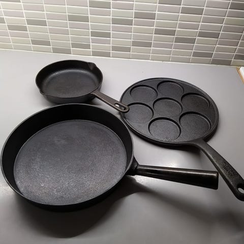 Kaksi laadukasta valurautapataa (Fiskars + Husqvarna) sekä valurautapannu.