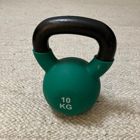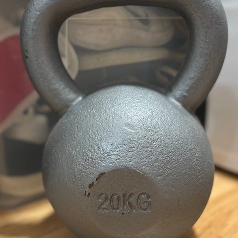 20 kg painoinen kahvakuula. Ihan hyvässä kunnossa muuten, mutta hieman naarmuja laidassa (näkyvät toisessa kuvassa).