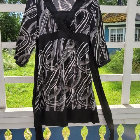 Pienellä blingillä oleva mekko valkoisena, naisten koko 38. Mekossa on koristeelliset yksityiskohdat yläosassa ja se on valmistettu kevyestä sifonkimaisesta materiaalista. Ei jousta.