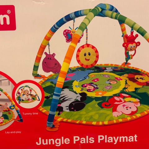 Ihana leikkimatto / babygym, jossa on pehmeä materiaali ja beige-ruskea väritys. Matossa on ristikko, johon on kiinnitetty leluja vauvan viihdykkeeksi. Sopii vauvojen leikkialustaksi ja harjoitteluun. Lelut kilisevät ja alustassa on pari rapinapintaa. Tällä on leikitty pitkään ja hartaasti, mutta tosi hyvässä kunnossa on edelleen.