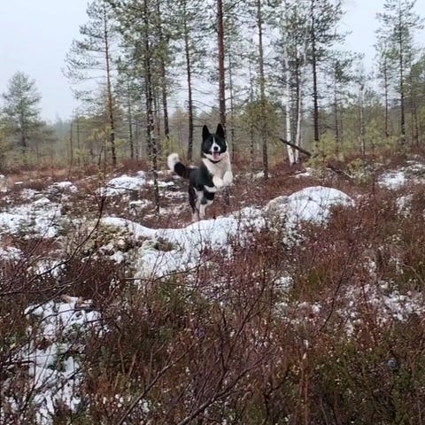 Koiralla on lyhyitä työskentelyjä hirvillä, mutta vaikuttaa ettei oikein intoa, sitkeyttä riitä tarpeeksi, tai sitten vain tarvitsee vielä aikaa ja paljon, metsää on kyllä saanut riittävästi.