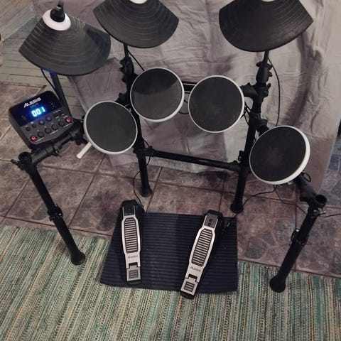 Hyvä mesh pädeillä oleva setti.Erillinen hi-hat.Basaripedaali.Tuoli.JBL aktiivikaiutin mukaan.Toimii harjoitus käytössä.3 cymb.pädiä.Voidaan harkita vaihtoa rumputavaraan.