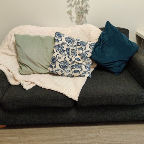3:n istuttava harmaa kangaspäällysteinen sohva.